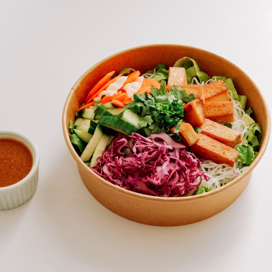 CRISPY LEMONGRASS ORGANIC TOFU, VERMICELLI RICE NOODLES, LETTUCE, CUCUMBER, RED CABBAGE, CILANTRO, MINT, PICKLED VEGGIES WITH ROASTED ALMOND BUTTER HOISIN SAUCE