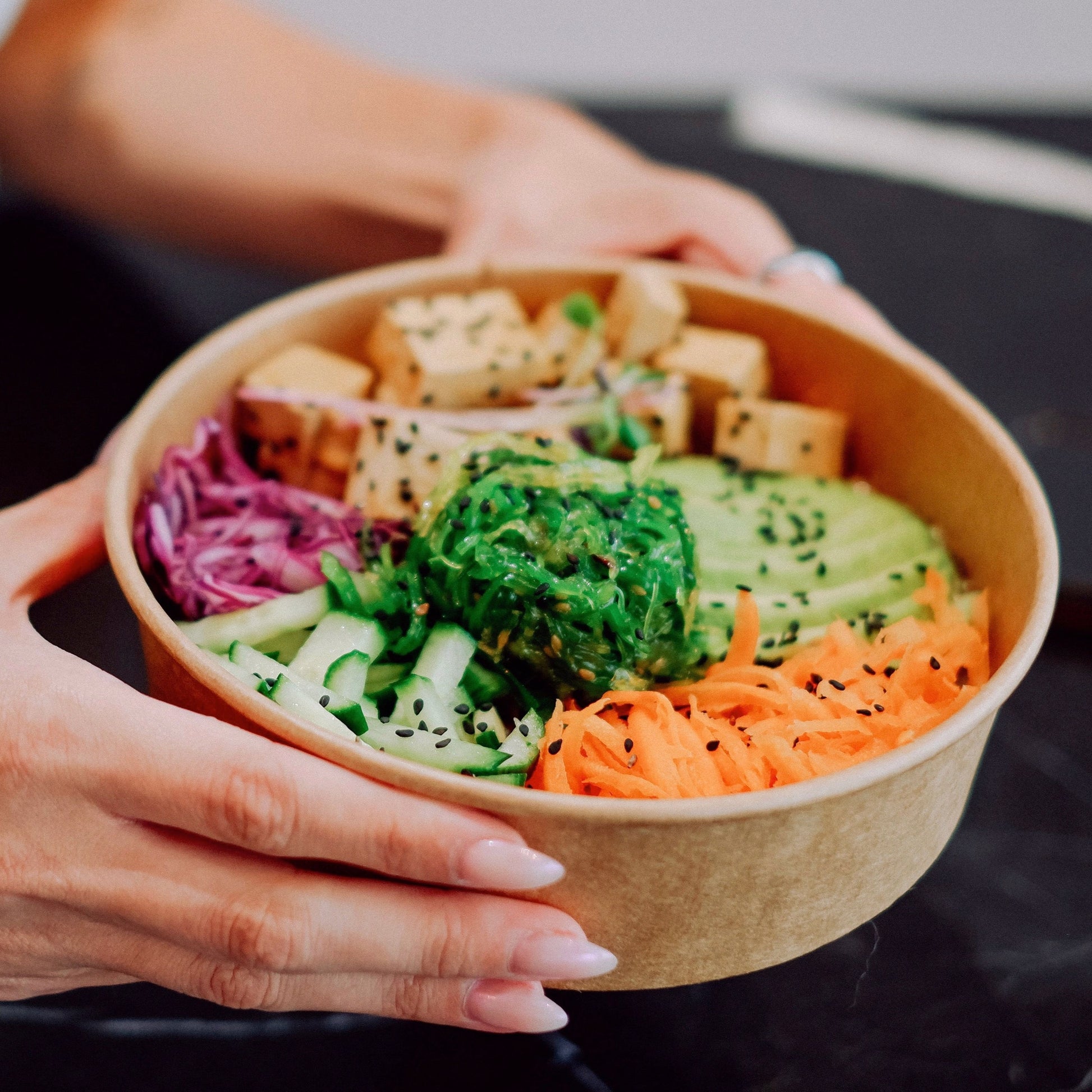 MARINATED ORGANIC TOFU IN HOUSE POKÉ SAUCE, AVOCADO, SHREDDED CARROTS, RED CABBAGE, CUCUMBERS, SESAME SEEDS + SEAWEED SALAD ON A BED OF WARM SEASONED SUSHI RICE